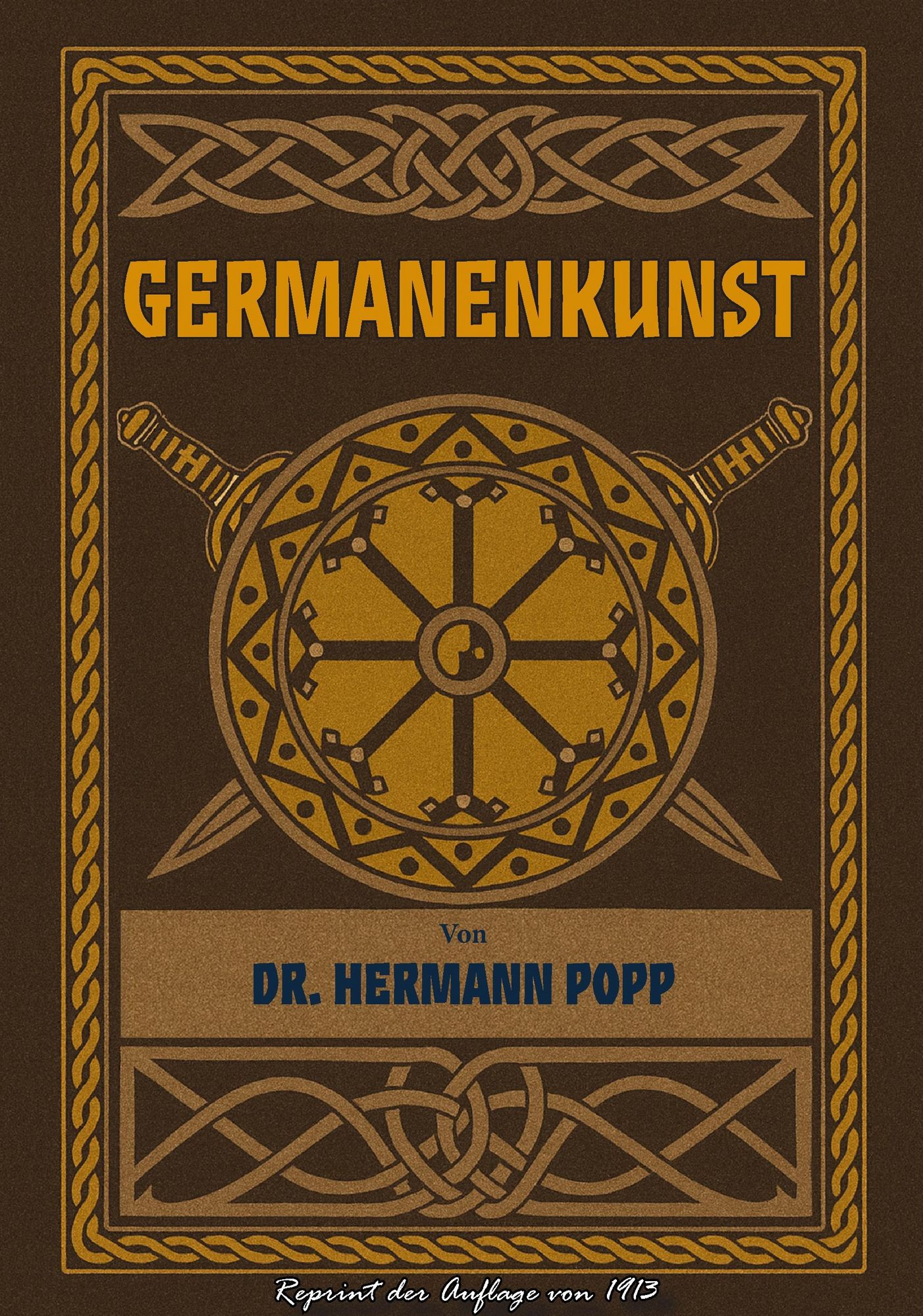Der Autor Dr. Hermann Popp (1871–1943) war Kunsthistoriker und verfasste mehrere Bücher; Germanenkunst hatte dabei die größte Auflage, da es nicht nur ein Verkaufsbuch war, sondern 1913/1914 als Beigabe der Monatszeitschrift Heimat und Welt erschien. Die Zeitschrift wurde mit Unterstützung des Vereins für das Deutschtum im Ausland herausgegeben und hatte eine beachtliche Auflage von 20.000 Exemplaren (Januar 1914). In dem hier vorliegenden Werk räumt Popp mit vielen Vorurteilen in Bezug auf germanische Kunst auf und macht sie den Deutschen anschaulich – unterstützt durch über 90 Abbildungen. Damals in Fraktur gesetzt, liegt es in der jetzigen Ausgabe neu gesetzt gut lesbar vor.